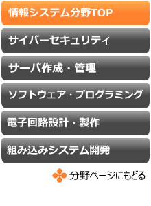 情報システム分野では学内の情報処理及び情報システムに関する教育・研究に必要な技術業務、技術開発、学部学生・大学院学生等の実験実習の指導を行っています。具体的にはサイバーセキュリティ、サーバ作成・管理、ソフトウェア・プログラミング、電子回路設計・製作、組み込みシステム開発等に関わる業務を継続的に実施することにより、より良い環境の実現・サービス提供を目指しています。